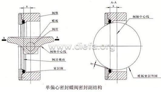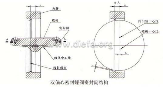 由于蝶板的回轉(zhuǎn)中心(即閥門(mén)軸中心)與蝶板密封截面按a偏心設(shè)置,使得蝶閥在開(kāi)啟過(guò)程中,蝶板密封面逐漸脫離閥座密封面,蝶板轉(zhuǎn)動(dòng)至20°~25°時(shí),蝶板密封面完全脫離閥座密封面,完全開(kāi)啟時(shí),兩密封面之間形成間隙x,從而使得蝶閥在啟閉過(guò)程中,兩密封面之間相對(duì)機(jī)械磨損及擠壓大為降低,從而保證了蝶閥的密封。