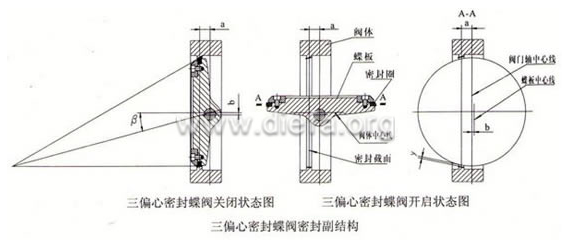 由于在雙偏心蝶閥的基礎(chǔ)上將閥座中心線再與閥體中心線形成一個(gè)β角偏置,使得蝶閥在啟閥過(guò)程中,蝶板的密封面在開(kāi)啟瞬間立即脫離閥座密封面,而在關(guān)閉瞬間才會(huì)接觸并壓緊閥座密封面。當(dāng)完全開(kāi)啟時(shí),兩密封面之間形成一個(gè)與雙偏心密封蝶閥相同的間隙y,該類(lèi)蝶閥的設(shè)計(jì),徹底消除了兩密封面之間的機(jī)械磨損和擦傷,使蝶閥的密封性能和使用壽命都得到大大提高。