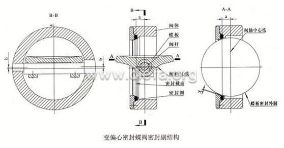 變偏心蝶閥的獨(dú)特之處在于安裝蝶板的閥桿軸是一個(gè)三段軸式結(jié)構(gòu),此三段軸式閥桿兩段軸段同心,而中心段軸中心線與兩端軸線偏離一個(gè)中心距,蝶板就安裝在中間軸段上。這樣的偏心結(jié)構(gòu)使得蝶板在全開(kāi)位置時(shí)成為雙偏心狀,而在蝶板轉(zhuǎn)動(dòng)到關(guān)閉位置時(shí)則成為單偏心狀。由于偏心軸的作用,在接近關(guān)閉時(shí),蝶板向閥座的密封錐面內(nèi)移進(jìn)一個(gè)距離,蝶板與閥座的密封的密封面相吻合達(dá)到可靠的密封性能。