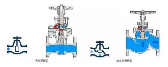 截止閥是低進高出,從外觀看有明顯的管道不在一相水平線上。閘閥流道在一個水平線上。閘閥的行程比截止閥的要大。