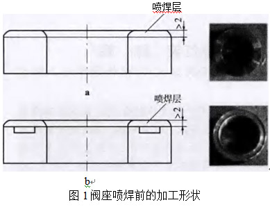 為了避免等離子弧高加熱速度和溫度產生的涂層剝落破壞的開裂、飛濺、滴流及其他不良影響,在任何加工形式時應仔細選擇噴涂規范。等離子弧噴焊時的工藝參數如表1所示。等離子噴涂噴槍的功率40 kw,送粉方式為槍外送粉。另外,噴嘴到工件距離為1儺巧mm,工作臺轉速10、巧r/min等離子弧噴焊時和噴焊后的閥座外觀如圖2所示。