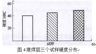 三個試樣硬度分析結果如圖4所示。由于鎳基堆焊合金層存在較高的cr,會形成更多化合物相,且其組織細小均勻,硬度較高,滿足耐磨性的要求。