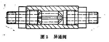 在氣缸下部進出口處安裝一只降噪異通閥,此閥進氣時由于阻尼作用,能夠控制啟動氣流量,排氣時則自動轉(zhuǎn)換成正常通路。同時,活塞下部氣缸間的空間容積盡可能變 小。在這二個條件同時具備情況下,當(dāng)楔式閘板受活塞和閥桿推力開動》活塞快速移動一小距離時,其下部空間壓力隨即變小,甚至產(chǎn)生瞬時負壓。從而可減小或避免氣流沖九達到降噪目的。見圖1。為了降低開閥噪聲我所自制了一只降噪異通閥(見圖2),用于氣動閘閥壽命試驗氣路上,試驗中對閥門啟動有較好的減噪作用。由于當(dāng)時受試驗用閥門的氣動構(gòu)件設(shè)計制造情況所限,其實際空間容積 VG較大,上述二個條件中小的條件不滿足,因而降噪程度還未能達到要求。筆者認為,如果進一步降低VG,則降噪效果將會提高。