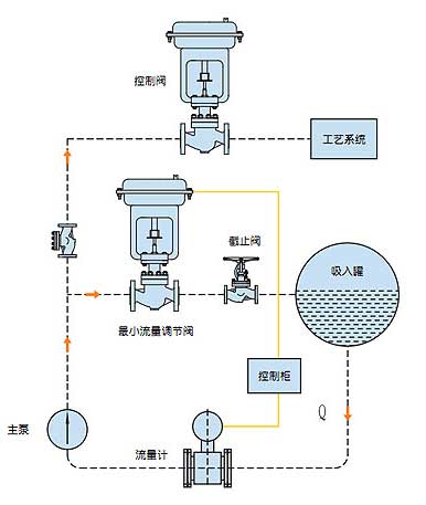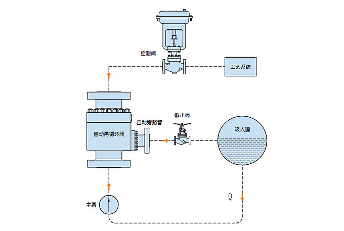 現代工業設備工藝過程中,要求離心泵基本上都是在變流量的狀態下工作,這就需要在工藝過程中有設置自動控制設備。然而咋離心泵在低于負荷運行時會出現過熱、嚴重噪聲、不穩定和氣蝕而引起泵的損壞。這是需要一種自動再循環設備,在泵低于負荷運行時,通過旁路實現泵最小流量回流循環。